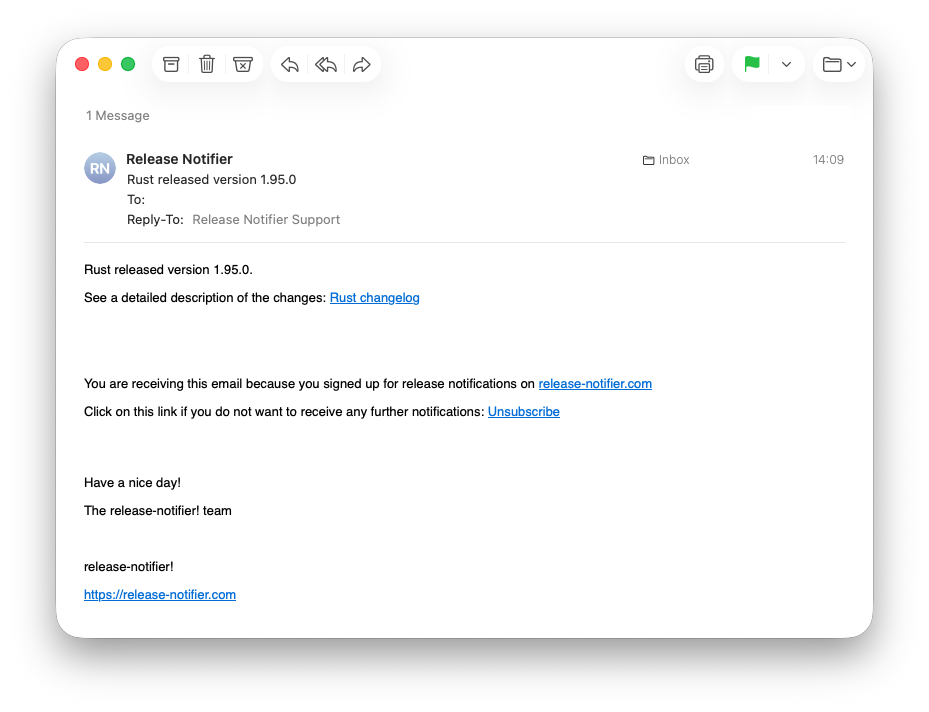 Simple to set up and simple to receive. Receive notifications by email for every new release of your used software. Every software will be checked hourly for new releases and if there is a new one, you’ll get notified.